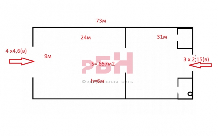 - 2 ворот сквозные в торцах помещения 4м х 4,6 м (в) и 3м х 2,15(в);