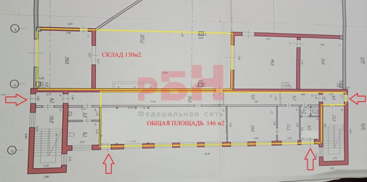 Общая площадь помещений( без склада) 146 м2. В настоящий момент открытое пространство 55м2 + кабинеты, бытовые помещения и коридор, возможна перепланировка с увеличениемоткрытого пространства до 136 м2