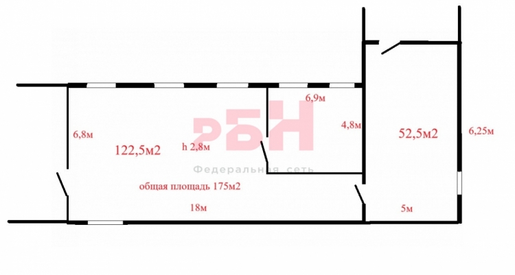 - помещение 122,5м2 размеры 18м х 6,8м, в площадь помещения входит кабинет 33м2,