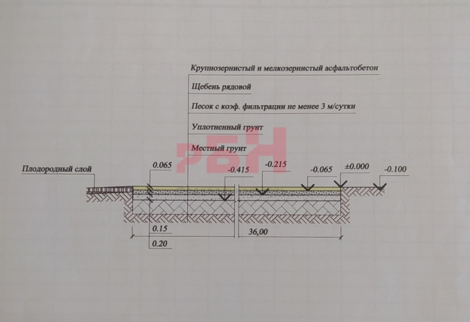- площадь асфальтового покрытия 4151 кв.м, толщина: асфальт 6,5см, щебень 15см, песок 20см ;