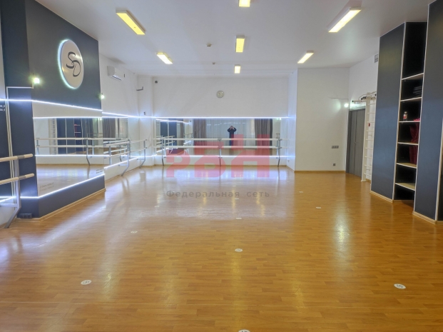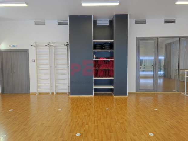 -высота потолков в зале -3,41 м, полы – спец. покрытие для занятий, стены покрашены, зеркала по периметру, большое панорамное окно, светодиодное освещение, кондиционер, кладовая для хранения спорт инвентаря;