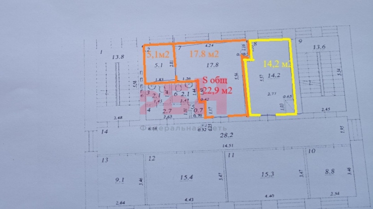 - офисное помещение 22,9 м2 включает в себя кабинет 17,8м2 и смежный 5,1 м2;